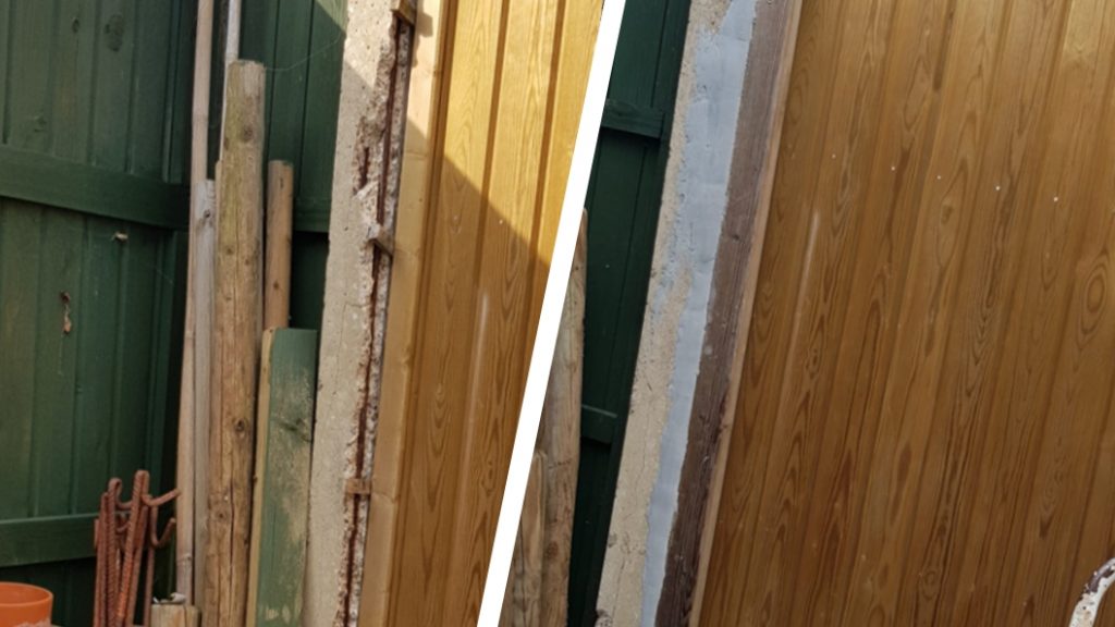 Large voids in a rotted wooden beam are filled to create a flat, smooth surface enabling the outside of a house to be rendered as part of a home renovation project