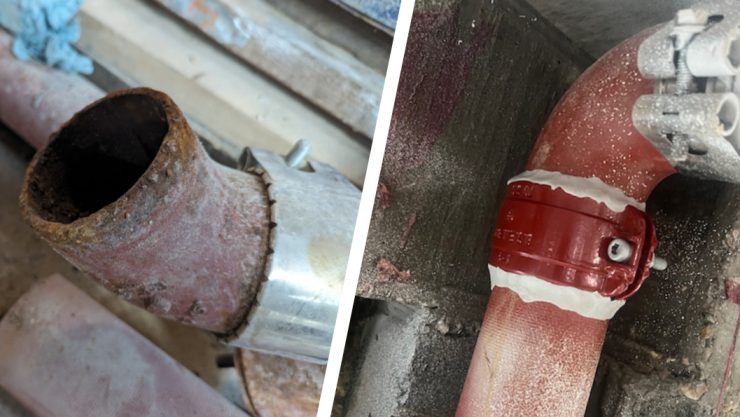 When these rubber seals were removed, the pipe ends underneath were discovered to be badly corroded where water had become trapped. Because of the uneven pipe surface, pitting and breaches caused by corrosion, it was now impossible to achieve a watertight seal.