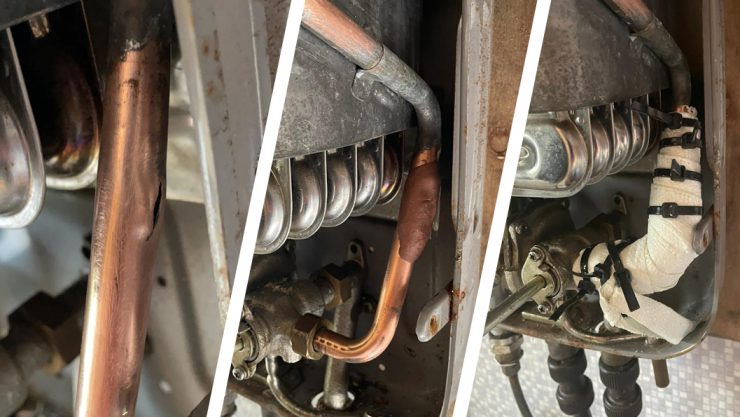 The boiler system provided heat and hot water to the camper van. A deep crack appeared in a copper pipe located underneath the cover of the boiler, causing a pressurised jet of water to spray out whenever the boiler was turned on.