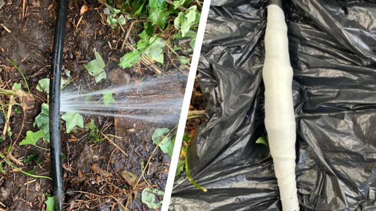 Gaining access to make a hose repair was extremely difficult because of the roots, the shrubs and the proximity of the retaining wall. To repair the split in the plastic hose, a versatile solution was therefore needed.