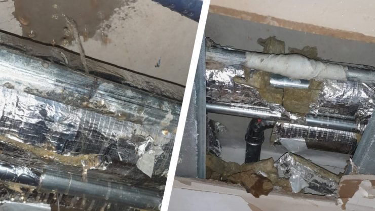 Flow could not be turned off, as this would have involved shutting down heating across the entire building. A live leak repair to the district heating system was therefore necessary, using lightweight materials which could be easily carried and applied from the top of a ladder used to reach the ceiling.